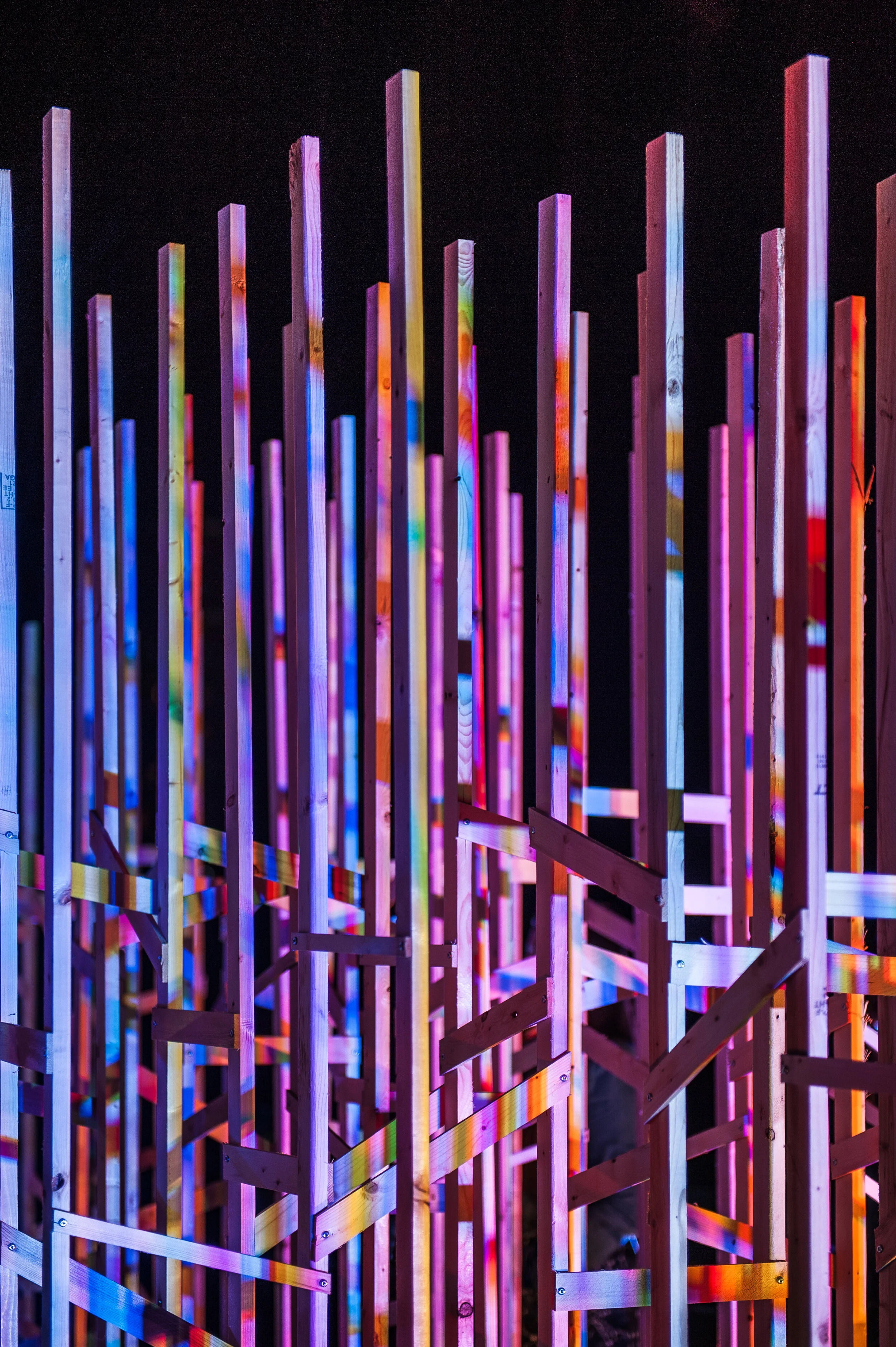 Luminous Cloud explores defined space and layers of illumination in a temporary installation. The project seeks to engage users through the use of light projection and the creation of void space in the confines of a grid. The project is encountered as a porous cloud of illuminated sticks in the park. The cloud shimmers with moving coloured light from all angles. Several entry points can be found around the perimeter drawing visitors within. Inside, one walks through serpentine paths carved out of the gridded space. People stop inside for conversations with friends, and return later at night to experience it once again, as the cloud is always changing.