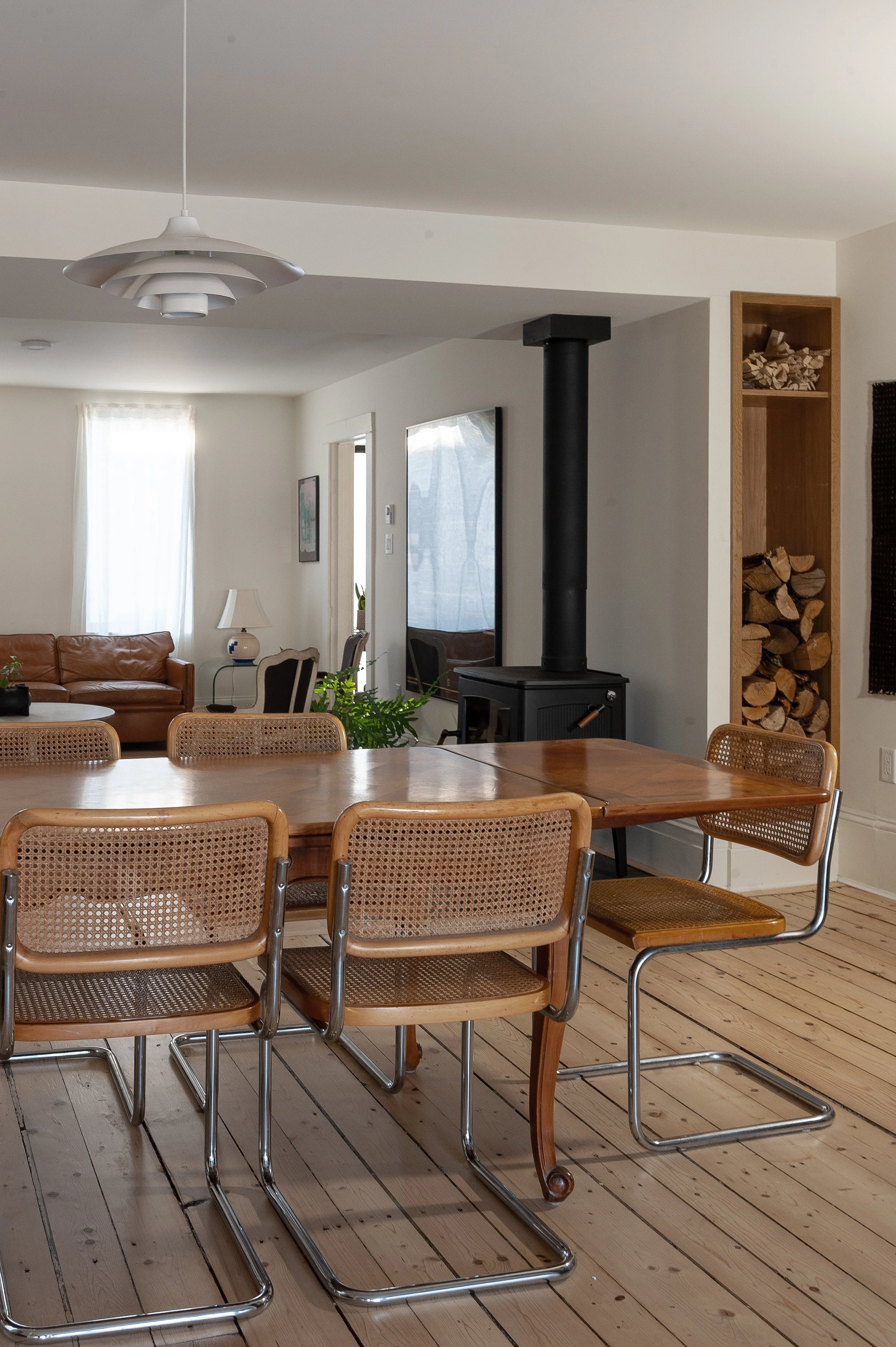 Much like the palimpsest of floor boards in this house, the new layers are woven into the old. Opening up the interior of the house to the garden beyond, natural light can now flood the space. A new wood stove and open kitchen with warm wood details makes this house a delight in the winter and summer. Upstairs the project involved a careful transformation of the original three bedrooms to four, so that each child could have their own room.